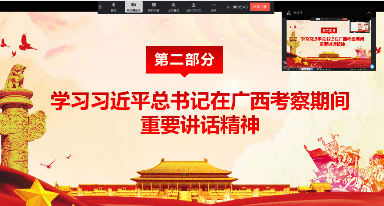 接着支部委员杨光安、王科分别带领大家学习了《习近平总书记在广西考察期间重要讲话精神》、习近平总书记署名文章《用好红色资源,传承好红色基因把红色江山世世代代传下去》等两篇中央文件。夏亦欣带领大家学习了金华市委七届九次全会精神。