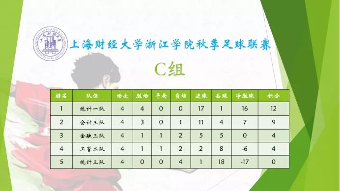 C组方面,统计一队与会计三队顺利取得淘汰赛门票,统计一队更是在小组赛中仅失一球,展现出了强大的统治力;会计三队表现稳健,取得了三胜一负的优异成绩顺利晋级。下面附上C组最终积分榜。