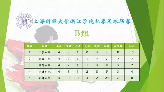 A组方面,会计一队与会计二队携手出线,会计一队在小组头名的争夺战中以3:2的比分击败会计二队,确保小组赛全胜以头名晋级;排名第二的会计二队也展现出了强大的进攻火力,小组赛多场比赛取得大比分领先,队内多人取得进球。下面附上A组的最终积分榜。