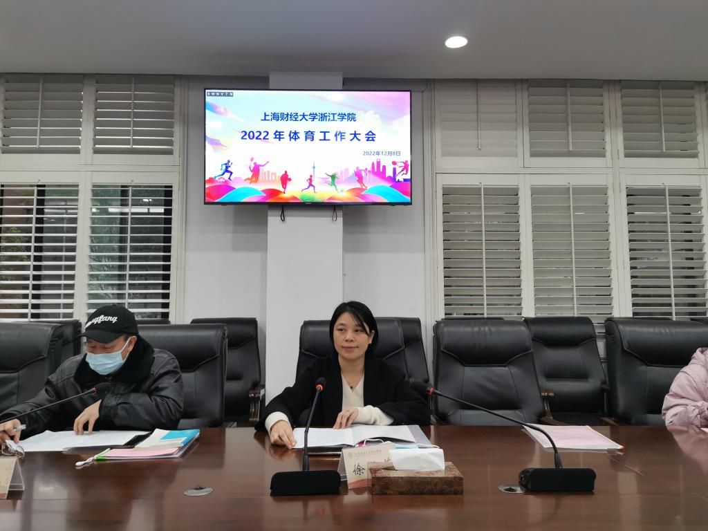 2022年12月8日下午,公共基础部、体育教学部在28-108会议室召开上海财经大学浙江学院2022年学校体育工作会议。学院副院长邱风、学院党委委员、体育运动委员会主任徐玉芳出席会议,各职能部门负责人、各系部主任、书记(副书记)以及学工办主任等参加会议。本次大会由公共基础部直属党支部副书记刘荣华主持。