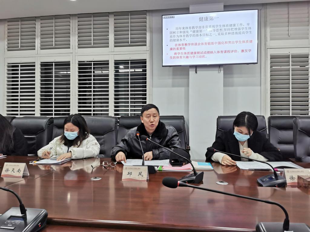 公共基础部、体育教学部主任顾雪兰作体育工作汇报,顾雪兰主任分别从近些年我院师资队伍、体育课程建设、体育设施条件等方面对我院的体育工作进行了回顾。多年以来,我院体育工作在学院领导的关心和支持下,在相关部门的积极配合下,取得了一定的成绩,但与新时代对体育教育的要求还有很大的距离,急需得到提升。