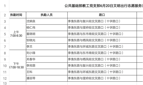 2018年6月20日,公共基础部教工党支部党员于当天早上7:00-8:30,晚上5:00-6:30时段参与马路爱心大使(在指定路口指挥交通)活动。