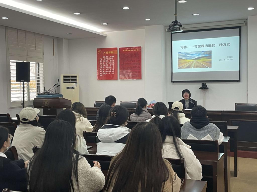 12月7日公共基础部有幸邀请到金华日报社主任记者兼作家来我院与师生交流,当天下午14:30李悄红还在28-118党员之家为我院师生讲座,题为“写作——与世界沟通的一种方式”。