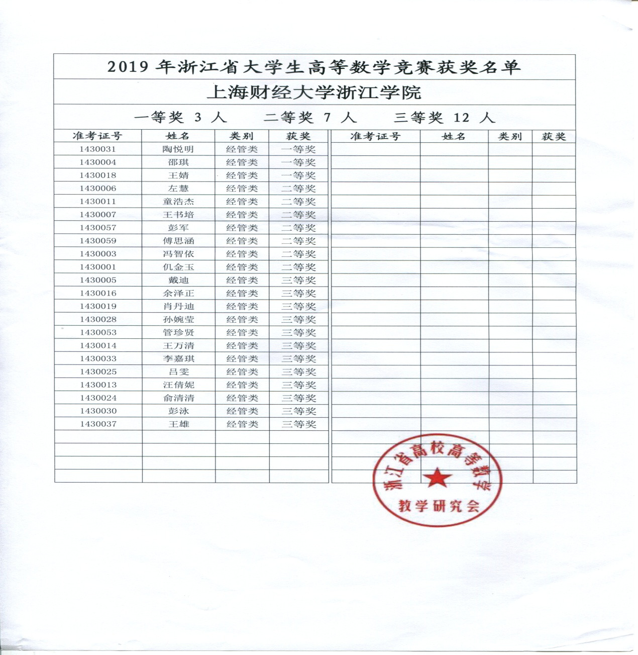 近日,在2019年浙江省大学生高等数学竞赛中,我院学子努力拼搏、沉着应对,最终,取得了一等奖3人、二等奖7人、三等奖12人的好成绩。