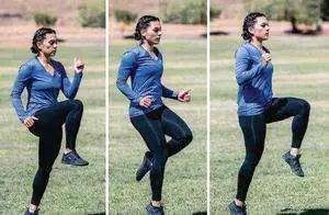 跳跃时使用完美的姿态和手臂动作。高高抬起一侧腿的膝盖,并保持它完全屈曲,同时脚踝保持背屈并接近臀部。