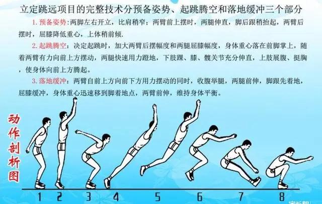 要点:小腿前伸的时机把握好,曲腿前伸臂后摆,落地后往前不往后。