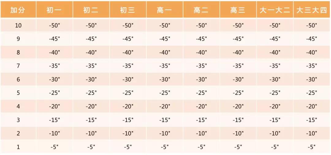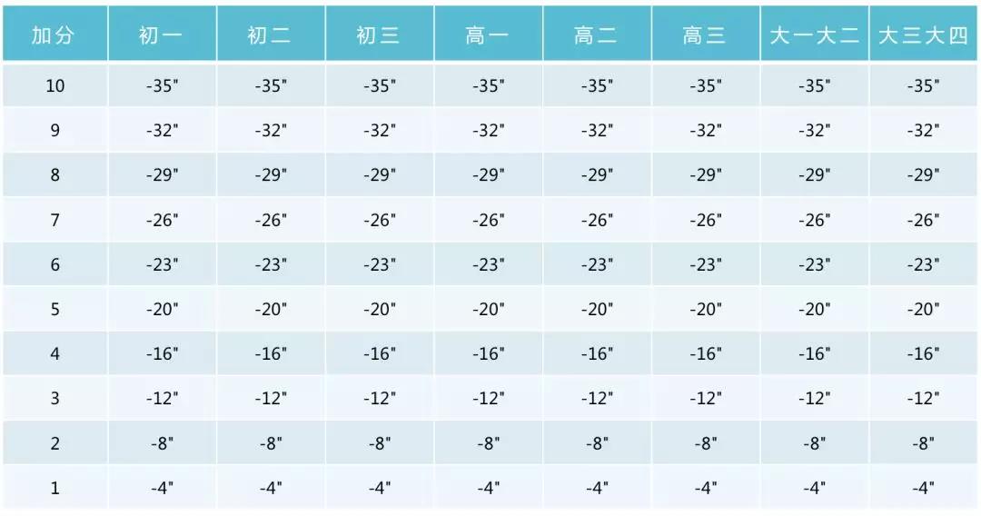 注:1000米跑、800米跑均为低优指标,学生成绩低于单项评分100分后,以减少的秒数所对应的分数进行加分。