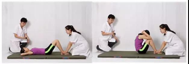 受试者仰卧于软垫上,两腿稍分开,屈膝呈90°,两手手指交叉贴于脑后。同伴按压其踝关节,以固定下肢。