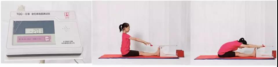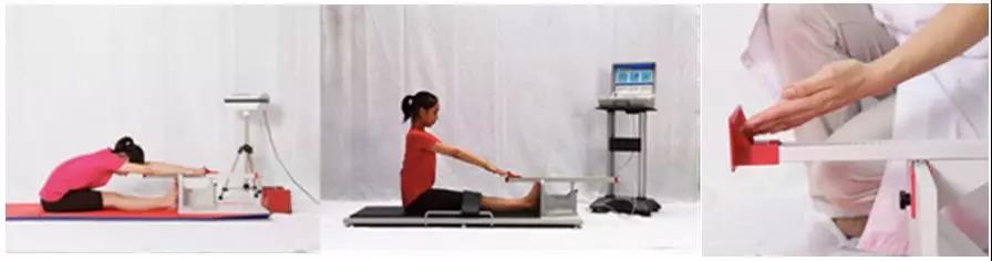 测试时,受试者双手并拢,掌心向下平伸,膝关节伸直,身体前屈,用双手中指指尖匀速推动游标平滑前行,直到不能推动为止。