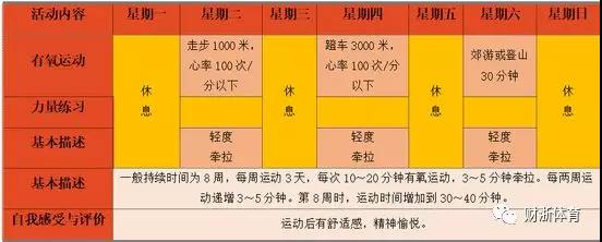 初期体育健身活动的时间约为8周,具体方案为: