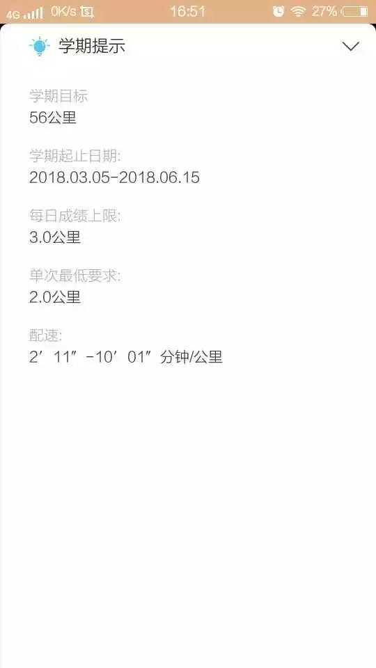 1、学校的每日上限\配速要求\跑步时间,都可以在学期提示里查看:APP首页-最下方-点击箭头进入
