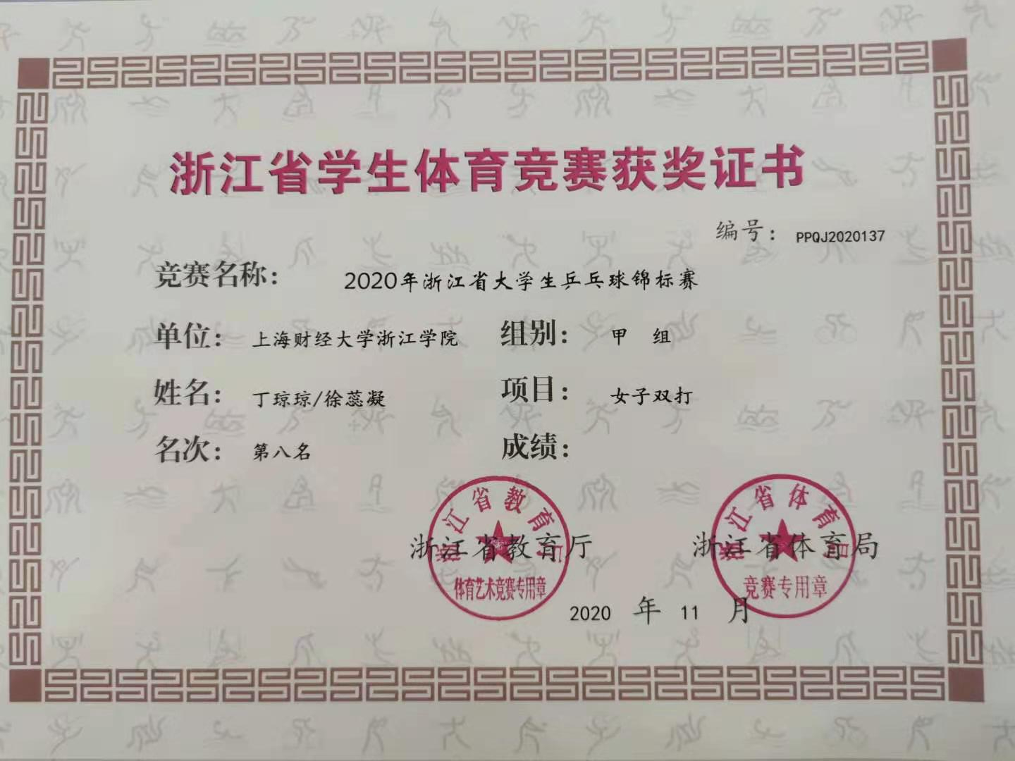 荣誉:2020年浙江省大学生乒乓球锦标赛 女双 第八名