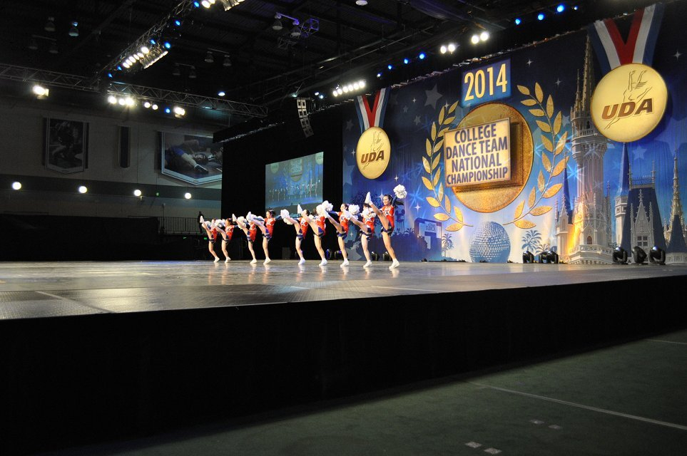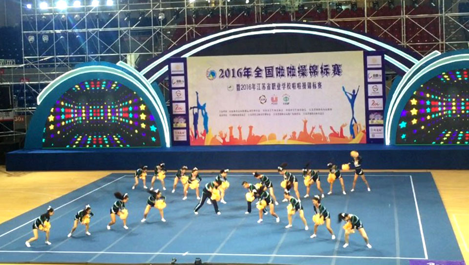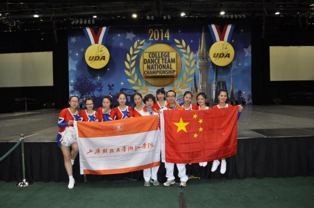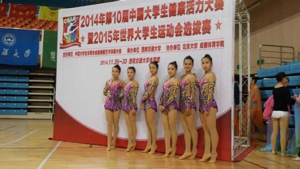 2014年是操队的丰收年头,首先我们迈出了国门,在美国的佛罗里达州世界大学生啦啦操锦标赛,我们的姑娘们毫无畏惧,在世界大学生啦啦操锦标赛上,斩获舞蹈啦啦操花球组第六名的优异成绩。